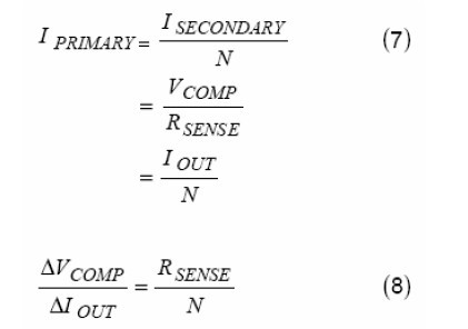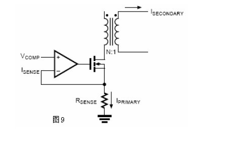 從ISECONDARY以后(見圖9),副邊電流或者說輸出電流與主邊電流成比例,把等式(4)重新排列表示出副邊電流與VCOMP之間的關(guān)系。