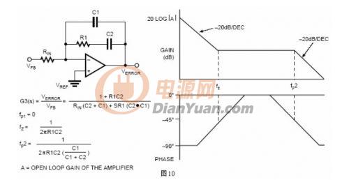 一旦輸出濾波器和PWM電路部分的傳輸函數(shù)確定下來,然后可以設(shè)定誤差放大器補(bǔ)償網(wǎng)絡(luò)以取得最優(yōu)化的系統(tǒng)性能。圖10例舉出一個在低頻時提供高的頻率滾降和高增益的補(bǔ)償方案。