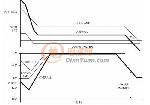 因?yàn)檫@是一個線性系統(tǒng),可以用疊加的方法得到整個系統(tǒng)的傳輸函數(shù)。通過把整個環(huán)路各部分的增益和相位疊加起來,產(chǎn)生整個系統(tǒng)的博得圖。通過放置補(bǔ)償網(wǎng)絡(luò)的極點(diǎn)和零點(diǎn)使系統(tǒng)的性能最優(yōu)化。圖11把各部分的博得圖結(jié)合起來,負(fù)反饋系統(tǒng)的180度相移也加入進(jìn)來了。