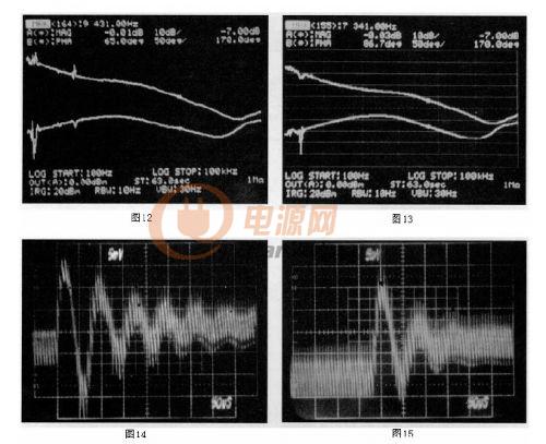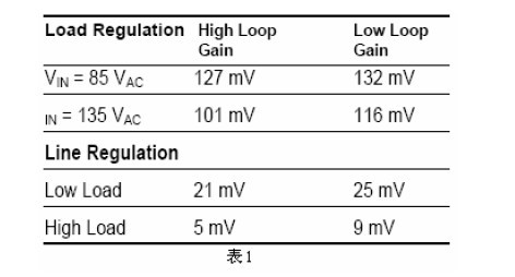構(gòu)造一個150W的電流模式正激轉(zhuǎn)換器,經(jīng)過修正的小信號環(huán)路特性顯示出它在系統(tǒng)瞬態(tài)響應(yīng)時所起的作用。圖13(原文誤為圖12,譯注)給出它的增益-相位圖。與圖11所展示的一樣,獲得了相同的博得圖曲線。此增益相位圖顯示這個系統(tǒng)有86.7度的相位裕量。意味著穩(wěn)定的系統(tǒng)有快速的瞬態(tài)響應(yīng)。圖15(原文誤為圖13,譯注)給出系統(tǒng)的瞬態(tài)響應(yīng)。為了展示相位裕量的作用,通過增加整個系統(tǒng)的增益和提高穿越頻率,系統(tǒng)的相位裕量會減少。穿越頻率提高時系統(tǒng)的相位裕量在減少。圖12(原文誤為圖14,譯注)給出更高的穿越頻率和更少的相位裕量(65度)時的系統(tǒng)博得圖。其瞬態(tài)響應(yīng)見圖14(原文誤為圖15,譯注),注意更少的相位裕量導(dǎo)致更大的振蕩和更長的調(diào)節(jié)時間。表1比較了這兩個不同增益大小的系統(tǒng)之間線性和負(fù)載調(diào)節(jié)率的變化。正如前面所述,高的環(huán)路增益得到更緊密的線性和負(fù)載調(diào)節(jié)率。還應(yīng)該注意需在高的相位裕量和較低的環(huán)路增益之間取得平衡。