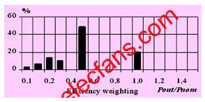 對于傳統(tǒng)電力電子裝置的設(shè)計,我們通常是通過每千瓦多少錢來衡量其性價比的。但是對于光伏逆變器的設(shè)計而言,對最大功率的追求僅僅是處于第二位的,歐洲效率的最大化才是最重要的。因為對于光伏逆變器而言,不僅最大輸出功率的增加可以轉(zhuǎn)化為經(jīng)濟效益,歐洲效率的提高同樣可以,而且更加明顯。歐洲效率的定義不同于我們通常所說的平均效率或者最高效率。它充分考慮了太陽光強度的變化,更加準確地描述了光伏逆變器的性能。歐洲效率是由不同負載情況下的效率按照不同比重累加得到的,其中半載的效率占其最大組成部分(見圖1)。