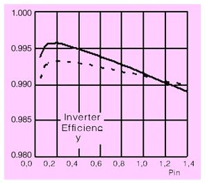 圖6 flowsol-bi逆變電路效率仿真結(jié)果-ee=99.2%標準igbt全橋-ee=97.2% (虛線)