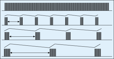 突變模式技術(shù)又稱打嗝模式(hiccupmode)或周期省略模式(圖3)。在負載很大情況下,回掃電路根據(jù)輸出電壓變化來調(diào)制脈沖寬度。當(dāng)負載降低到一定程度時,控制電路將維持原有脈沖寬度,轉(zhuǎn)而周期性跳過部分脈沖,控制電路通過降低總脈沖寬度或增加遮蔽周期長度達到降低損耗的目的。該技術(shù)有兩個明顯的缺點,即低頻干擾會和遮蔽周期一起出現(xiàn),而且負載突然改變也會造成輸出電壓突降。