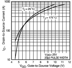 在MOSFET的數據表中,通常可以找到它的典型的傳輸特性。注意到25℃和175℃兩條曲線有一個交點,此交點對應著相應的VGS電壓和ID電流值。若稱這個交點的VGS為轉折電壓,可以看到:在VGS轉折電壓的左下部分曲線,VGS電壓一定時,溫度越高,所流過的電流越大,溫度和電流形成正反饋,即MOSFET的RDS(ON)為負溫度系數,可以將這個區(qū)域稱為RDS(ON)的負溫度系數區(qū)域。