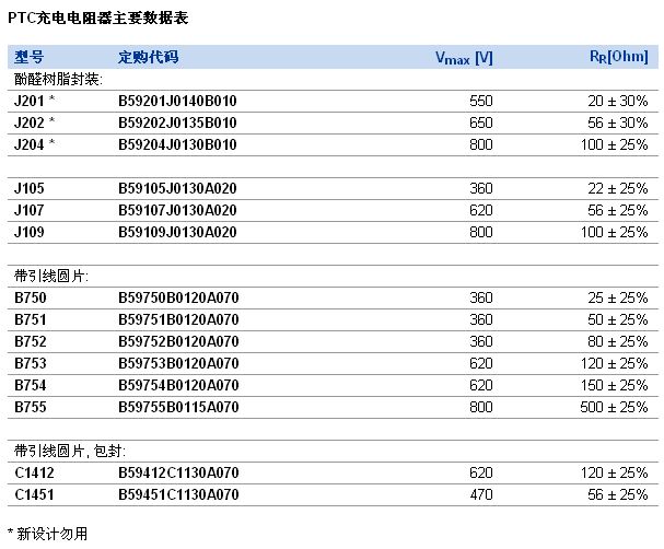 普通電阻在電容充電時(shí)常用來限制電流。不過,這常有技術(shù)風(fēng)險(xiǎn)。舉例來說,當(dāng)短接電容器時(shí),如果電容器短路或者繼電器失靈,電阻器將持續(xù)暴露在大功率電平下。這可能導(dǎo)致電阻器或者整個(gè)系統(tǒng)遭到破壞。愛普科斯采用基于PTC陶瓷的新式J20X系列充電電阻器,現(xiàn)已研發(fā)出一種專業(yè)解決方案:在自我防護(hù)的同時(shí),還實(shí)現(xiàn)了相對(duì)緊湊的尺寸。如下表所示,J20X系列包括J201、J202和J204產(chǎn)品。