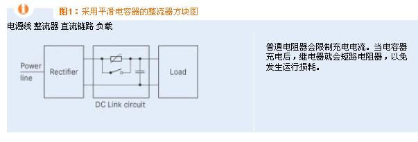 當(dāng)電容器充電時(shí),通常需要串聯(lián)一個(gè)電阻器來限制充電電流,以免產(chǎn)生超過允許范圍的強(qiáng)電流峰值。一般是采用固定式普通電阻或負(fù)溫度系數(shù)(NTC)電阻實(shí)現(xiàn)這一功能。在大多數(shù)情況下,會(huì)在充電之后使用一個(gè)由時(shí)間或電壓控制的繼電器來短接限流元件。充電電流的制約對(duì)整流器和轉(zhuǎn)換器系統(tǒng)來說非常重要,因?yàn)楫a(chǎn)生的沖擊電流峰值如果未得到限制,可能會(huì)觸發(fā)熔絲或使整流器遭受超過允許范圍的強(qiáng)電流。圖1所示為傳統(tǒng)整流器或轉(zhuǎn)換器系統(tǒng)的方塊圖。