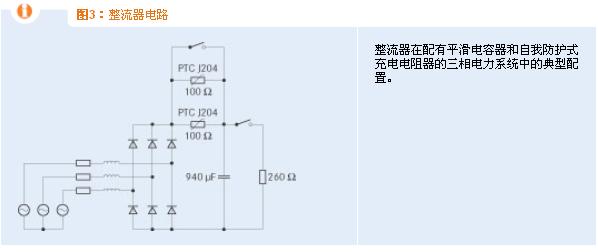 [page]上述電路采用三相橋式整流器,并將其接至相導(dǎo)線電壓為400 VRMS的電源中。其中平滑電容器的電容為940 μF。并聯(lián)電路含有兩個(gè)B59204J0130B010型充電電阻器,用于限定沖擊電流。亦稱為零電位電阻器,其額定電阻在25℃的環(huán)境溫度下為100 ?。在這種情況下,需要并聯(lián)兩元件:因?yàn)殡娔鼙仨氃诔潆娖陂g內(nèi)傳到電容器,這會(huì)使單個(gè)B59204J0130B010電阻器開始發(fā)熱,直至溫度高出允許范圍,結(jié)果便導(dǎo)致電阻大大加強(qiáng)。這一情況應(yīng)當(dāng)避免,否則將無法對(duì)鏈路電容器進(jìn)行徹底充電。