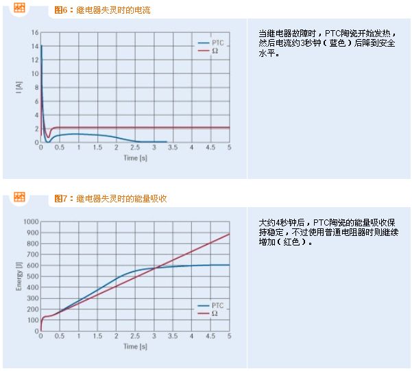 當(dāng)發(fā)生故障時(shí),PTC熱敏電阻用作限流元件的優(yōu)勢(shì)就會(huì)十分明顯。如果繼電器接通失敗,負(fù)荷電流將流經(jīng)充電電阻器,并產(chǎn)生強(qiáng)大的熱應(yīng)力,這要求電阻器有相應(yīng)的尺寸。若采用基于PTC陶瓷的充電電阻器,其電阻會(huì)由于強(qiáng)大的起始功率損耗而升至數(shù)10 k,從而能夠在故障發(fā)生期間限定電流(參見圖6)。在約三秒之后,先流經(jīng)兩電阻器然后流經(jīng)總體電路的電流已跌至數(shù)10 mA。有關(guān)吸取能量的比較,請(qǐng)參見圖7。
