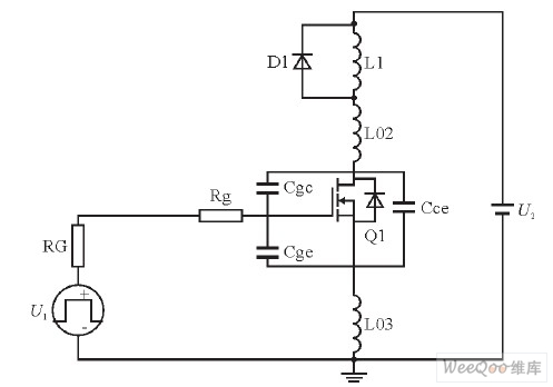 RG+Rg是IGBT的柵極電阻, L01、L02、L03是雜散電感(分布電感), Cgc、Cge、Cce是IGBT的極間電容, U1是驅(qū)動(dòng)控制信號(hào), U2為母線電壓。