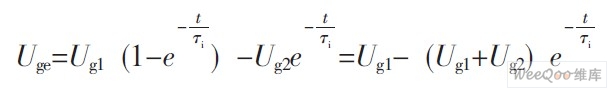 二極管D1導(dǎo)通時(shí), 若Uge為所加的反向電壓值(可記為-Ug2, 正向電壓記為+Ug1), 集電極電流iC=0, Uce=U2。開(kāi)通后, U1向Cgc、Cge充電, 此時(shí)Uge可寫成: