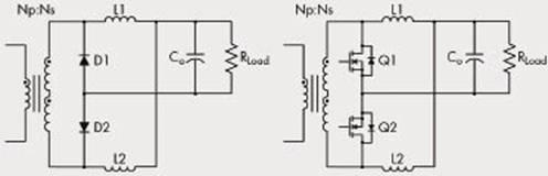 從拓?fù)涞慕嵌葋?lái)看,同步整流器的傳導(dǎo)損耗和開(kāi)關(guān)損耗都更低,能夠提高這些轉(zhuǎn)換級(jí)的效率,因而是開(kāi)關(guān)模式電源次級(jí)端的基本構(gòu)建模塊,在服務(wù)器電源或電信整流器等低壓及大電流應(yīng)用中非常流行。如圖1所示,它取代了肖特基整流器,可使電壓降變得更小。從器件角度來(lái)看,過(guò)去十年中,功率MOSFET晶體管的進(jìn)展巨大,催生出了新穎的拓?fù)浜透吖β拭芏入娫础?0世紀(jì)早期平面技術(shù)問(wèn)世之后,中低電壓MOSFET迅速被開(kāi)發(fā)出來(lái),利用溝槽柵技術(shù)來(lái)大幅提高性能。溝槽柵MOSFET是中低電壓電源應(yīng)用的首選功率器件,其把一個(gè)柵極結(jié)構(gòu)嵌入到精心蝕刻在器件結(jié)構(gòu)上的溝槽區(qū)域中。這種新技術(shù)可以提高溝槽密度,并無(wú)需JFET阻抗元件,因此能夠使特征導(dǎo)通阻抗降低30%左右。當(dāng)MOSFET的導(dǎo)通阻抗與漏極電流的乘積小于二極管正向電壓降時(shí),同步整流的能量損耗降低。