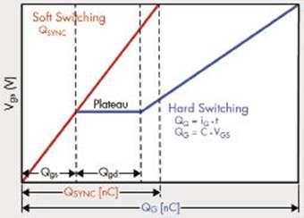 利用已知的電阻值,可通過(guò)下式求得QSYNC,這樣就可以更準(zhǔn)確地估算出柵極驅(qū)動(dòng)功耗。同步整流中,QSYNC較小,器件的性能也較好。如圖7所示,同步整流的功率MOSFFET的柵-源電壓上無(wú)平坦區(qū)。
