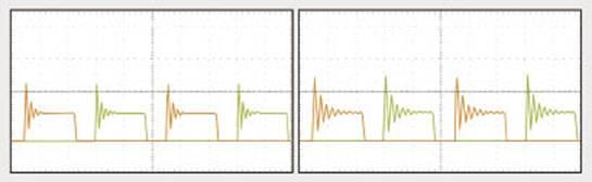 把有害電壓尖刺降至最小的一般原則是采用短而厚的電路板以及最小的電流回路。然而,由于尺寸和成本的限制,做到這些并不容易。有時(shí),設(shè)計(jì)人員必需考慮到機(jī)械結(jié)構(gòu)的問(wèn)題,如散熱器和風(fēng)扇;有時(shí)鑒于成本限制因素,不得不使用單面印制電路板。緩沖電路可作為一種可行的替代方案,用來(lái)在最大額定漏源電壓范圍內(nèi)管理電壓尖刺。這種情況下,額外的功耗是無(wú)法避免的。此外,輕載下緩沖電路本身產(chǎn)生的功耗也不可忽視。除了電路板參數(shù)之外,器件的特性也對(duì)電壓尖刺電平有影響。在同步整流中,一個(gè)主要的器件相關(guān)參數(shù)是反向恢復(fù)期間的體二極管軟度因子(softness)?;旧?,二極管的反向恢復(fù)特性是由設(shè)計(jì)決定的。有好幾個(gè)控制輸入對(duì)反向恢復(fù)產(chǎn)生影響,如結(jié)溫、di/dt和正向電流水平。但是,當(dāng)條件固定時(shí),二極管總是表現(xiàn)出相同的行為。因此,器件的評(píng)估結(jié)果對(duì)評(píng)測(cè)系統(tǒng)的運(yùn)作情況非常有用。圖10所示為兩個(gè)不同器件(但有極其相似的額定值)的反向恢復(fù)波形。