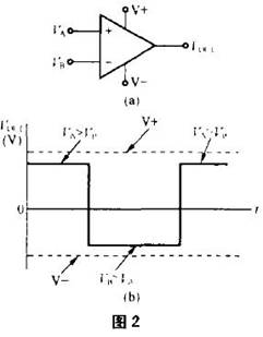圖2(a)是雙電源(正負(fù)電源)供電的比較器。如果它的VA、VB輸入電壓如圖1(b)那樣,它的輸出特性如圖2(b)所示。VB》VA時,Vout輸出飽和負(fù)電壓。