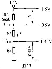 溫度傳感器采用NTC熱敏電阻RT,已知RT在0℃時阻值為333.1kΩ;5℃時阻值為258.3kΩ,則按1.5V工作電壓及流過R1、RT的電流約1.5 uA,可求出R1的值。R1的值確定后,可計算出0℃時的VA值為0.5V(按圖10中R1=665kΩ時),5℃時的VA值為0.42V,則VTHL=0.42V,VTHH=0.5V。若設(shè)R2=665kΩ,則按圖11,可求出流過R2、R3、R4電阻的電流I=(1.5V-0.5V)/665kΩ=0.0015mA,按R4×I/=0.42V,可求出R4=280kΩ再按0.5V=(R3+R4)0.0015mA, 則可求出R3=53.3kΩ。