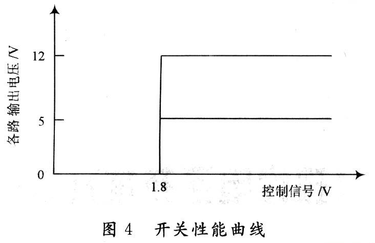 場效應管選擇了增強型P溝道場效應管IRF9640和增強型N溝道場效應管VN2222L。以場效應管IRF9640作為開關管來控制電路的通和斷,以場效應管VN2222L作為開關控制管來控制場效應管IRF9640的開和關。當控制信號輸入端輸入高電平時,開關電路導通;當控制信號輸入端輸入低電平時,開關電路斷開。經(jīng)過試驗測得:當控制信號電壓從0 V逐漸上升到1.8 V時開關導通;當電壓從高電平(如3.3 V)逐漸下降到1.8 V時開關斷開。此開關電路的性能如圖4所示。