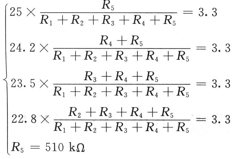 電池電壓取樣電阻網(wǎng)絡是通過取樣電阻的組合對電池的輸出電壓進行分壓取樣,各電阻端點對應的電池電壓狀態(tài)值分別為:R2對應22.8 V,R3對應23.5 V,R4對應24.2 V,R5對應25 V。當電池輸出的電壓值等于各個電阻設定的狀態(tài)值時,則該電阻端取樣電壓為3.3 V;當電池輸出的電壓值大于各個電阻設定的狀態(tài)值時,則該電阻端取樣電壓大于3.3 V;當電池輸出的電壓值小于各個電阻設定的狀態(tài)值時,則該電阻端取樣電壓小于3.3 V。取樣電阻R1,R2,R3,R4,R5的取值可由下面的方程組求得: