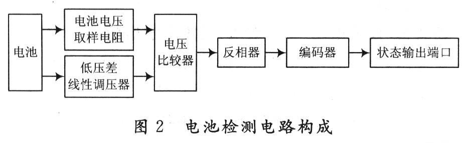 電池檢測模塊通過對供電電源輸出電壓取樣來判斷蓄電池的電量是否充足。在此將電源輸出電壓劃分為:25 V以上為電池電量滿狀態(tài)、24.2~25 V為電池電量充足狀態(tài)、23.5~24.2 V為電池正常工作狀態(tài)、22.8~23.5 V為電池電量不足但尚能工作狀態(tài)、22.8 V以下為電池不能正常工作狀態(tài)5個狀態(tài),通過狀態(tài)讀取來判斷電池能否正常為整個系統(tǒng)供電,決定是否為電池充電,以保證整個系統(tǒng)的正常運行。該模塊電路結構如圖2所示。