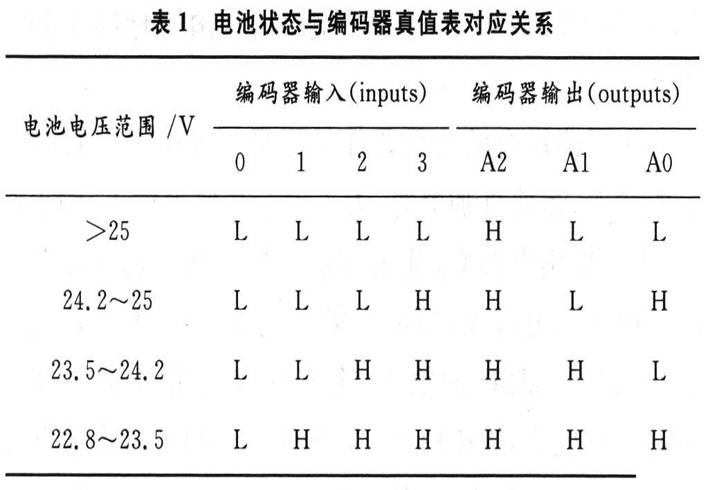 編碼器74HCl48低電平有效,所以在比較器LMl39的后面又接了反相器74HC04,編碼器輸入/輸出的二進制碼(真值表)與電池電壓的關系如表1所示。