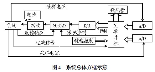(2) 軟件實(shí)現(xiàn)自動(dòng)保護(hù)控制。在負(fù)載端采樣電壓,通過單片機(jī)來查詢負(fù)載電平的高低控制SG3525 芯片的shutdown 端口來控制輸出,從而達(dá)到保護(hù)的目的。該方法簡(jiǎn)單,且為后續(xù)智能化過載保護(hù)的實(shí)現(xiàn)提供基礎(chǔ)。通過對(duì)該電源電路進(jìn)行方案論證,該系統(tǒng)的原理圖如圖4 所示。