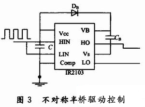 不對稱半橋驅(qū)動電路,如圖3所示。驅(qū)動集成芯片采用IR公司的IR2103,其輸出級作為推挽驅(qū)動輸出,以直接耦合的方式與主電路的開關管相連接,由HO和LO的輸出分別作為驅(qū)動橋式電路的上、下橋臂。為了實現(xiàn)上橋臂驅(qū)動電路的地電位與主電路的同步浮動,采用由DB和CB組成的外接自舉電路。