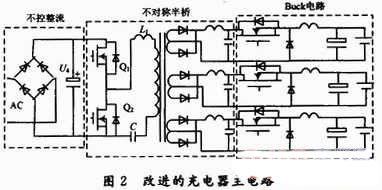 改進的新型充電器主電路,如圖2所示。前級采用軟開關不對稱半橋?qū)崿F(xiàn)了多路的隔離輸出,并且利用自身產(chǎn)生的寄生參數(shù),實現(xiàn)諧振式零電壓軟開關以此減小開關的損耗,同時也避免了因變壓器漏感而帶來的電壓尖峰。后級采用成熟簡單的Buck電路拓撲,實現(xiàn)降壓并用此來滿足三段式充電的要求。