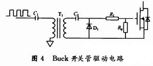 當驅(qū)動門極的輸出為高電平時,隔離變壓器驅(qū)動側電容能夠防止直流分量流過變壓器的初級,而另一側電容和二極管能夠把電壓變?yōu)閱螛O性。同時兩個電容的取值至少是MOSFET器件本身的門極電容的10倍。