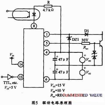 M57959L是日本三菱公司生產(chǎn)的混合集成IGBT驅(qū)動(dòng)器,其內(nèi)部原理結(jié)構(gòu)如圖4所示。它由高速光電隔離輸入,絕緣強(qiáng)度高,可與TTL電平兼容。內(nèi)藏定時(shí)邏輯短路保護(hù)電路,并具有保護(hù)延時(shí)特性。芯片由正負(fù)電源供電,克服了單電源供電時(shí)負(fù)電壓不穩(wěn)的缺點(diǎn),驅(qū)動(dòng)功率大,可驅(qū)動(dòng)200A/600V或100A/1200V的IGBT模塊。由M57959L構(gòu)成的驅(qū)動(dòng)電路如圖5所示。