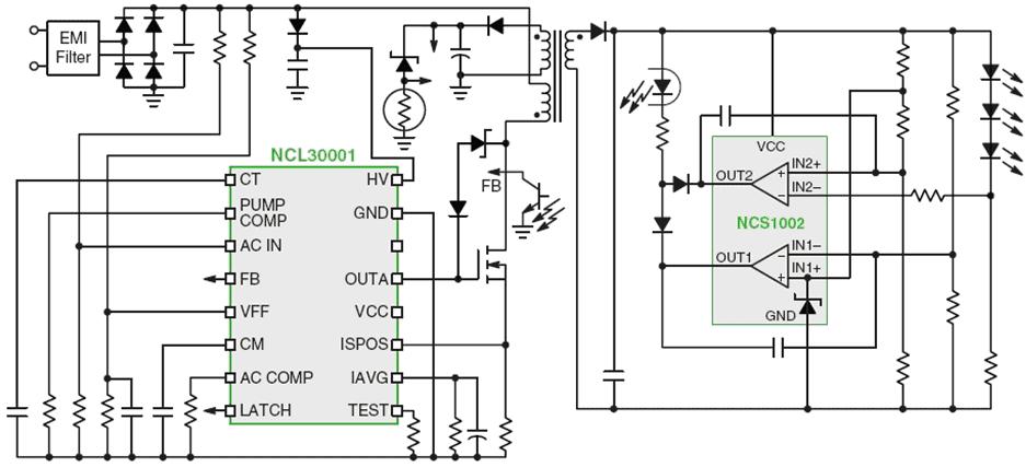 圖4:基于NCL30001 LED驅(qū)動(dòng)器和NCS1002控制器的90 W LED驅(qū)動(dòng)器演示板電路。