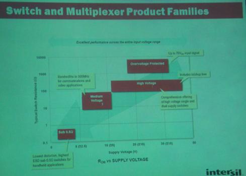 Roger還介紹了Intersil開(kāi)關(guān)和多路復(fù)用器及接口產(chǎn)品線的情況,其sub 0.5Ω開(kāi)關(guān)用于便攜應(yīng)用,中壓產(chǎn)品用于通信和視頻應(yīng)用,并且能提供高壓?jiǎn)?雙電源開(kāi)關(guān)等。