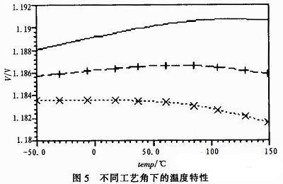 圖5為不同工藝角下的溫漂仿真。仿真結(jié)果表明,此電路可以達到ref-45 ppm、bg-7.5 ppm的低溫漂。實際電路存在器件的不匹配和誤差等,雖然達不到理論上的溫漂,但通過仔細布版、修調(diào)帶隙核心電路中Rc1、Rc2,可以達到較低的溫漂。
