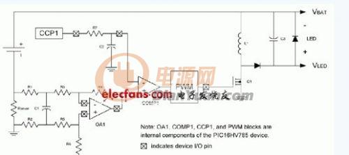然后,應(yīng)用程序代碼可以測量供電電壓(利用片上集成的10位A/D轉(zhuǎn)換器)和供電電流,從而保證驅(qū)動LED工作在恒定功率模式。隨著電池輸入電壓的變化,D/A電路(采用CCP外設(shè)實現(xiàn))將產(chǎn)生新的參考電壓值進行補償。