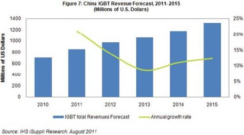 據(jù)IHS iSuppli公司中國研究服務(wù)即將發(fā)表的一份報(bào)告,由于綠色能源與能源效率得到更多的重視,以及政府投資支持和嚴(yán)格的能源政策,2011-2015年中國絕緣柵雙極型晶體管(IGBT)市場銷售額的復(fù)合年度增長率將達(dá)13%。