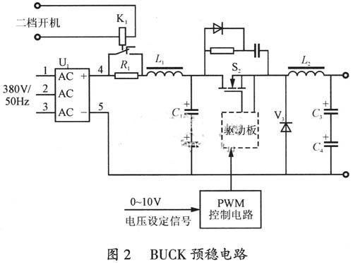 三相交流配電經(jīng)整流濾波電路之后,形成500V左右的直流電壓加在。BUCK預(yù)穩(wěn)電路的輸入端。其中K1為抑制合閘浪涌電壓而設(shè)置的,其二檔吸合信號(hào)由電源控顯電路給出。S2為BUCK功率開關(guān)管,其工作脈沖由PWM控制電路給出,為了保證電源具有足夠的動(dòng)態(tài)特性,該功率開關(guān)管工作頻率為100kHz左右。PWM控制器輸出脈沖寬度,由電壓設(shè)定信號(hào)給出。當(dāng)電壓設(shè)定信號(hào)由0~10V變換時(shí),PWM控制器輸出的脈沖占空比在0~0.85的范圍內(nèi)變化。L2為儲(chǔ)能電感,由于BUCK電路的占空比在0~0.85大范圍變化,為了保證電路起到預(yù)穩(wěn)作用,需要避免輸出電流斷續(xù),同時(shí)不至于設(shè)計(jì)余量過大,采用了額定負(fù)載條件下的計(jì)算值,實(shí)際工作情況良好。