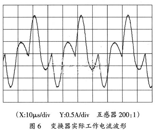 整個(gè)變換器電路依然采用PFM的工作模式,當(dāng)前級(jí)預(yù)穩(wěn)電源輸出0~500V直流電壓時(shí),變換器以固定的脈沖寬度驅(qū)動(dòng)橋臂的功率開關(guān)管。為了保證電源在電子槍束流產(chǎn)生時(shí)能穩(wěn)定工作,設(shè)計(jì)了取樣閉環(huán)控制功能,當(dāng)輸出偏離電壓設(shè)定值時(shí),變換器通過脈沖頻率調(diào)節(jié)得到穩(wěn)定的輸出,電子槍高壓電源實(shí)際工作頻率為3~25kHz。改進(jìn)后的串聯(lián)諧振變換器如圖5所示,變換器的實(shí)際工作電流波形如圖6所示。