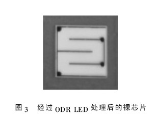本批實驗樣品采用揚(yáng)州華夏集成光電有限公司生產(chǎn)的芯片.對一塊外延片整體進(jìn)行測試,發(fā)現(xiàn)測試結(jié)果基本一致后試制成芯片. 將該外延片一半制做成普通LED 芯片,另一半制做ODR LED 芯片,芯片的尺寸為40 mil. 選取一個單元中的ODR LED芯片如圖3 所示,與圖2 比較,可以明顯看出芯片亮度不同.