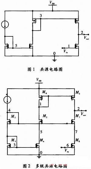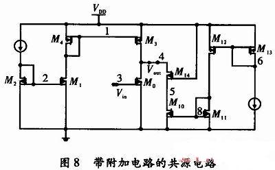 帶附加電路的共源電路如圖7和圖8所示,消除了使用工作以線性范圍內的共源放大器,從VDD到輸出節(jié)點電源波動的影響。