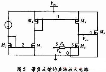 為構建負反饋方法改善PSRR,對一種帶有負反饋的共源放大電路進行了仿真,并與圖1中仿真的不帶負反饋的共源放大器進行了比較。負反饋的電路如圖5所示,輸出電壓被采樣并控制M6,由M6的電流通過R0轉換為電壓,輸出電流及M0的輸入電流混合構成。負載器件是PMOS管,其偏置電壓由一鏡像電路產生。在設計過程中,其電阻值是關鍵,因為它決定著增益和PSRR值之間的平衡。電阻值過大會損失增益。