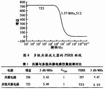 盡管共源共柵技術同比率改善了電路的增益和PSRR,但它卻隨之帶來較低的輸出擺幅和3 dB頻率點及較高的輸出阻抗,且不適于放大器的級聯(lián)和較高工作頻率等需求的應用中。負反饋技術在改善放大器PSRR的同時又穩(wěn)定了輸出。盡管負反饋技術減少了從電源到輸出節(jié)點的增益,如AVDD,并且增益了PSRR。但增益是按比例減少,B值能夠被合理的調整以達到增益要求。這一技術對工作在高頻中的電路有效。附加電路則是能夠給出最大PSRR值的技術,其結論能夠從3種技術的仿真數(shù)據(jù)輸出表里看出,并能維持較高的增益值。但它也有減小電路3 dB頻率點的不足,因為在輸出端引進了附加電容。因此,如表3中的電路2可以看到,這一電路能夠達到極高的PSRR值,卻是以很低的增益為代價。因此,該電路在設計含級聯(lián)放大器電路的設計中有重要作用,這里增益可通過級聯(lián)解決。附加電路能夠滿足電源波動穩(wěn)定性的需求。