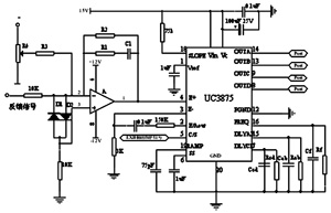 PWM移相控制是通過UC3875的誤差放大器來實現(xiàn)的,在UC3875的4角上接PI調(diào)節(jié)器,利用電壓傳感器將輸出電壓與給定基準(zhǔn)電壓相比較,從而控制A、B與C、D之間的相位,最終調(diào)整波形占空比,使電源穩(wěn)定在預(yù)定值上。A/B、D/C兩個半橋,可單獨進(jìn)行導(dǎo)通延時(即死區(qū)時間)的控制,在該死區(qū)時間內(nèi)確保下一個功率開關(guān)器件的輸出電容放電完畢,為即將導(dǎo)通的開關(guān)器件提供電壓開通條件。圖3所示是本設(shè)計的控制電路圖。