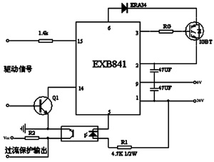 隨著IGBT在各類變流裝置中的廣泛應(yīng)用,IGBT驅(qū)動模塊的選擇及其性能越來越引起使用者的重視。理想的驅(qū)動模塊除了應(yīng)為IGBT提供足夠的開通和關(guān)斷柵壓外,還應(yīng)具備迅速、可靠的保護(hù)功能,同時力求電路簡單、穩(wěn)定。IGBT的常用驅(qū)動模塊有許多種,其中EXB系列應(yīng)用最廣。EXB841驅(qū)動模塊廣泛應(yīng)用于開關(guān)電源、UPS、電力傳動及電力補(bǔ)償?shù)阮I(lǐng)域。圖4所示是本設(shè)的IGBT的驅(qū)動電路圖。