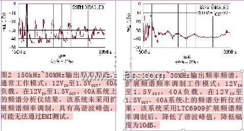 LTC6909上的擴(kuò)展頻譜頻率調(diào)制通過連續(xù)改變μModule的時鐘頻率,強(qiáng)制輻射能量分散開以改善EMI,防止該能量停留在任何接收器頻帶內(nèi)。μModule開關(guān)輻射的紋波是產(chǎn)生不需要的頻譜諧波的罪魁禍?zhǔn)?。LTC6909擴(kuò)展頻譜頻率調(diào)制功能通過一個偽隨機(jī)噪聲信號,將能量擴(kuò)展到一個寬的頻帶上,從而降低峰值電磁輻射,以降低諧波幅度。