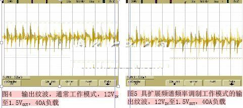 令人驚奇的是,對該系統(tǒng)進(jìn)一步的分析表明,在使用擴(kuò)展頻譜頻率調(diào)制時,輸出紋波沒有受到非常大的影響。有和沒有擴(kuò)展頻譜頻率調(diào)制的性能比較如圖4和圖5所示。比較兩圖中的峰峰值,觀察到的變化是很小的。如果仍不信服,可進(jìn)行另一個測試-負(fù)載瞬態(tài)響應(yīng)測試,以進(jìn)一步確證。