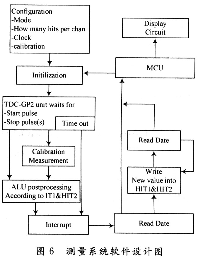 初始化之后,TDC-GP2高速測量單元接收到START脈沖后開始工作,達到設(shè)置的采樣數(shù)或者遇到測量溢出后才停止工作。軟件設(shè)計的重點在于根據(jù)需要設(shè)置TDC-GP2的工作模式和讀取其內(nèi)部的測量數(shù)據(jù)。在測量結(jié)尾,ALU開始依照HIT1和HIT2的設(shè)置處理數(shù)據(jù)并把結(jié)果送入輸出寄存器。如果不進行校準(zhǔn),ALU傳輸16位原始數(shù)據(jù)到輸出寄存器;如果進行校準(zhǔn),則ALU傳輸32位的固定浮點數(shù)到輸出寄存器。然后通過單片機AT89S52處理后,在液晶顯示器讀取時間間隔數(shù)據(jù),其測量流程如圖6所示。