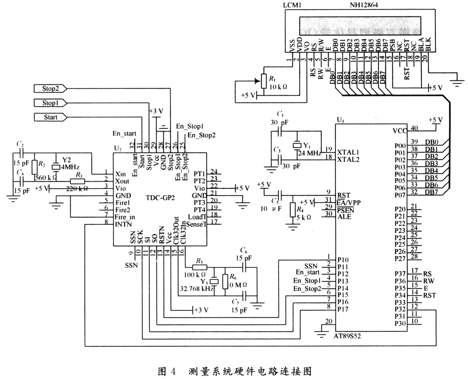 系統(tǒng)主要由脈沖信號取樣器、脈沖輸入信號整形電路、TDC-GP2測量電路、AT89S52單片機、液晶顯示電路、電源電路、時鐘電路組成。TDC-GP2的每個測量通道都提供一個使能引腳,可獨立地設(shè)置這兩個引腳進行通道選擇。TDC-GP2需要一個2~8 MHz的高速時鐘進行校準(zhǔn)用。TDC-GP2只是在進行時間測量時才必須用振蕩器,且能夠自動控制振蕩器的開啟時間。整個系統(tǒng)的硬件電路連接如圖4所示。