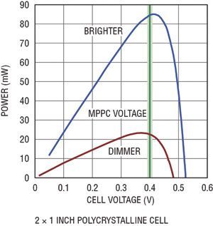當(dāng)選擇MPPC跟蹤電壓時(shí),各種不同的工作條件都必須考慮。一般情況下,最大功率點(diǎn)不會(huì)隨著照明條件的變化而顯著移動(dòng)。因此,有可能做到的是,選擇一個(gè)跟蹤電壓,以在很寬的照明強(qiáng)度范圍內(nèi),保持靠近最大功率點(diǎn)工作。即使在極端照明情況下,工作點(diǎn)可能不是準(zhǔn)確地位于最大功率點(diǎn)上,輸出功率相比理性情況的降低通常也僅為5%~10%。