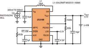 串聯(lián)連接的高壓光伏電池組能提供充足的功率,但單節(jié)光伏電池解決方案卻很少見,因?yàn)閱喂?jié)光伏電池在有負(fù)載情況下產(chǎn)生的電壓很低,從這么低的電壓難以產(chǎn)生有用的電源軌。幾乎沒(méi)有升壓型轉(zhuǎn)換器能從電壓很低、阻抗相對(duì)較高的單節(jié)光伏電池產(chǎn)生輸出。不過(guò),LTC3105是專門為應(yīng)對(duì)這類挑戰(zhàn)而設(shè)計(jì)。該器件具有超低的250mV啟動(dòng)電壓和可編程最大功率點(diǎn)控制,能從富有挑戰(zhàn)性的光伏電源產(chǎn)生大多數(shù)應(yīng)用所需的典型電壓軌(1.8~5V)。
