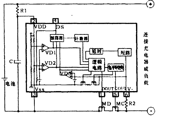 在放電時,若電池電壓低于過放電檢測電壓并保持相應(yīng)的延遲時間,DOUT端由高電位變?yōu)榈碗娢?,放電控制MOS管MD關(guān)斷,芯片進入過放電保護模式,停止放電。