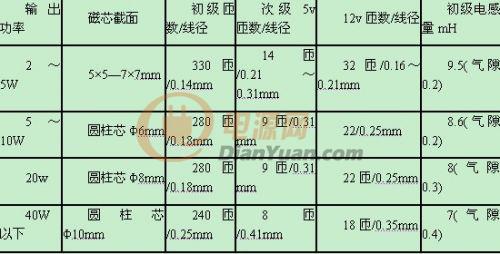 制作RCC型電源關鍵是脈沖變壓器T的繞制。無論何種開關電源脈沖變壓器的計算是極繁瑣又極不準確的,對業(yè)余制作者來說通過估算,實驗調整來確定比較實際。即使是估算也涉及磁芯材料,結構的影響,限于目前市場產品參數(shù)的離散性,業(yè)余者也難以確定,此處只列出部分計算結果供參考。小功率開關電源脈沖變壓器制作參數(shù)(繞組功能參考附圖)如附表所示。