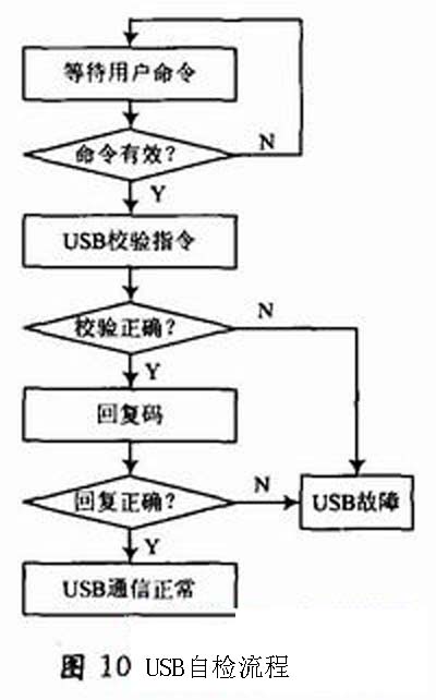 為了保證設(shè)備本身的工作正常,電纜測(cè)試系統(tǒng)提供自檢功能。自檢流程分為兩部分,第一部分對(duì)USB通道進(jìn)行自檢,USB自檢流程如圖10所示。系統(tǒng)上電后,工控機(jī)發(fā)送校驗(yàn)指令,單片機(jī)判斷校驗(yàn)碼是否正確,在校驗(yàn)碼正確的情況下,按照協(xié)議返回復(fù)碼,工控機(jī)判斷回復(fù)碼正確的情況下,USB通信建立正常。第二部分是對(duì)繼電器陣列進(jìn)行自檢,其流程與導(dǎo)通測(cè)試類似。以測(cè)試點(diǎn)1和測(cè)試點(diǎn)2為例,首先,閉合測(cè)試點(diǎn)1的輸入繼電器,采樣測(cè)試電壓,如果系統(tǒng)判斷為斷開(kāi),則可以說(shuō)明測(cè)試點(diǎn)1的輸出繼電器沒(méi)有常閉,反之則說(shuō)明為常閉故障。把測(cè)試點(diǎn)1的輸入繼電器更換為輸出繼電器,采用同樣的方法可以判斷出測(cè)試點(diǎn)1的輸入繼電器是否為常閉故障。其次,分別打開(kāi)測(cè)試點(diǎn)1的輸入和輸出繼電器,如果系統(tǒng)判斷為導(dǎo)通,在第一步的基礎(chǔ)上就可以說(shuō)明兩個(gè)繼電器均正常;如果系統(tǒng)判斷為斷開(kāi),則兩個(gè)繼電器中至少有一個(gè)為常開(kāi)故障。最后,在外部端口上接入自檢插頭,分別選擇測(cè)試點(diǎn)1的輸入繼電器和測(cè)試點(diǎn)2的輸出繼電器,如果系統(tǒng)判斷為導(dǎo)通,則可以說(shuō)明內(nèi)部繼電器和單板到端口的引線正常,反之則說(shuō)明繼電器到測(cè)試端的引線出現(xiàn)問(wèn)題。